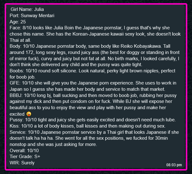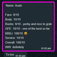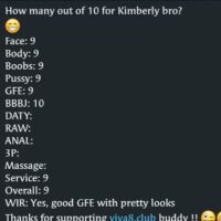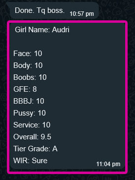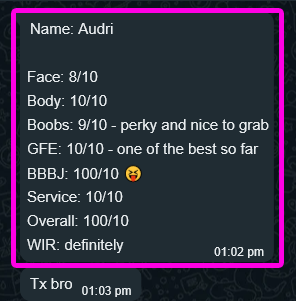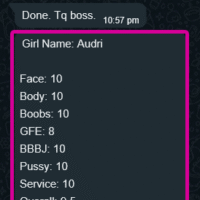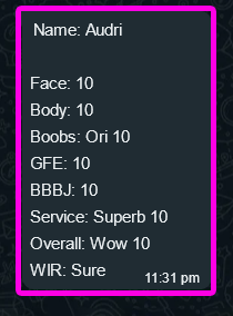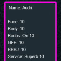 MMF 3P(Tip), CumInMouth(Tip), Ass-Rimming(Tip), CumOnBoobs(Tip), CumOnFace(Tip), Massage(10mins), French-Kiss, BB-BlowJob, FuckJob, DATY, 69